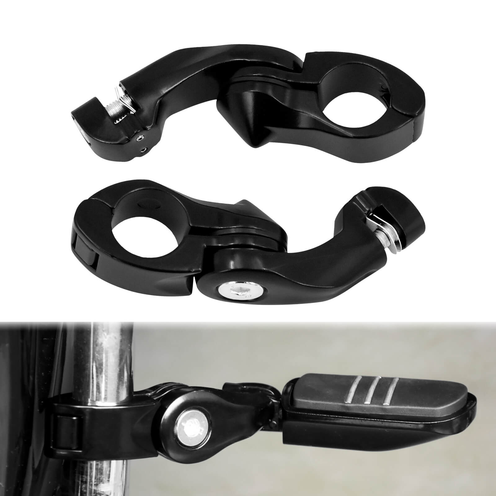 • Mounting clamp firmly grips the engine guard, and the locking design secures the peg at the desired angle.